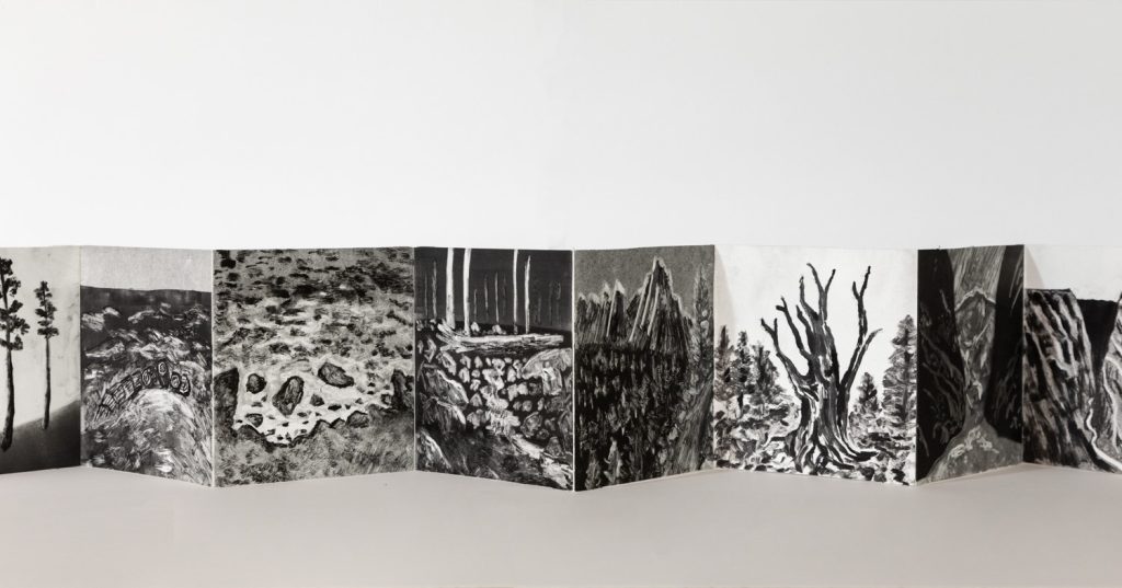 Erica Reed Lee, “Memories at a Distance”, 2021, Monotype Artist Book, 6 x 6 inches closed, 12 pages.